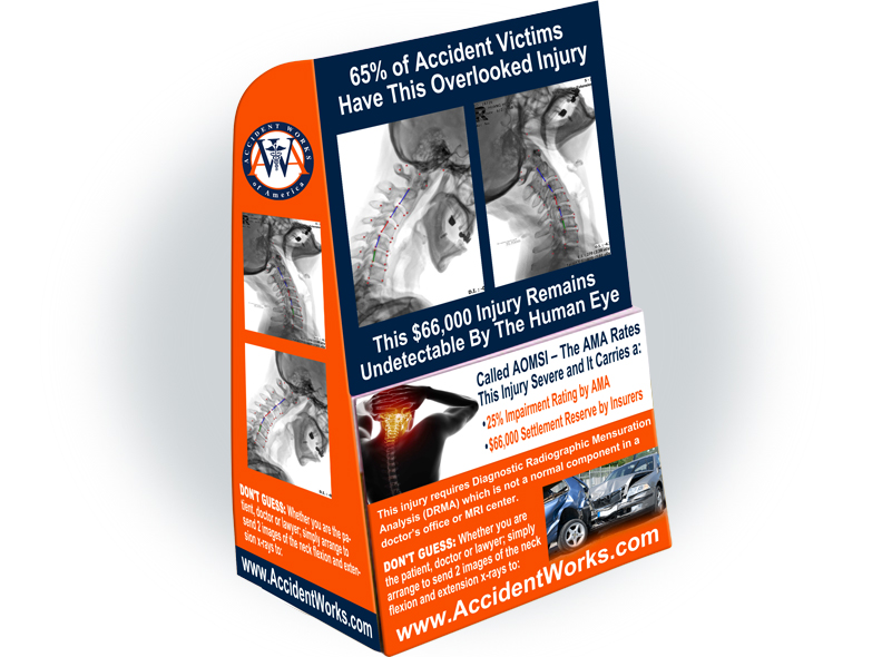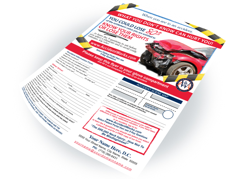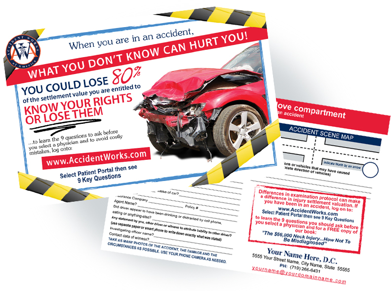 The “Glove Box kit” is an excellent way to get in front of an accident victim at their time of need because usually the first thing the whiplash victim does is reach into their glove box for their insurance card and vehicle registration. There they are very likely to see the Glove Box Kit which is a very useful tool at the time of the accident. Not only does the card provide useful data for the accident victim to record at the time of the accident and on the accident scene, but it also notifies them, of the difference in providers which could cost them up to 80% of their claim valuation. This gives you an on-the-scene Brand without having to pay out other expensive advertising & marketing fees to create a brand.